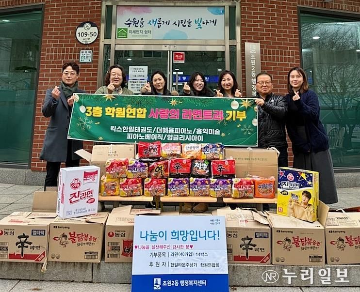 (누리일보) 수원시 장안구 조원2동은 지난 24일 관내 한일타운주상가 학원 연합회로부터 어려운 이웃을 위한 라면 40개입 14박스를 기탁받았다고 전했다.