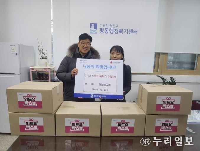 (누리일보) 수원시 권선구 고색동 소재 하늘성교회는 지난 23일 성탄절을 맞이하여 '위드유박스' 21박스를 평동 행정복지센터에 전달했다.