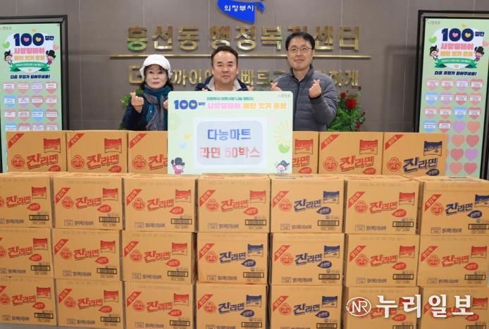 (누리일보) 의정부시 흥선동행정복지센터는 12월 24일 다농마트가 ‘100일간 사랑릴레이 배턴 잇기’에 동참해 라면 50상자를 기탁했다고 밝혔다.