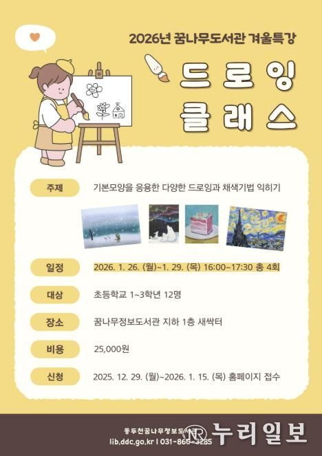 (누리일보) 동두천시 도서문화사업소 꿈나무정보도서관은 초등학생을 대상으로 한 2026년 겨울방학 특강 프로그램을 운영한다고 밝혔다.
