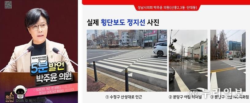 (누리일보) 성남시의회 박주윤 의원(국민의힘, 신흥2·3동·단대동)은 12월 18일 열린 제307회 성남시의회 제3차 본회의 5분 발언에서 보행자의 생명과 직결된 ‘횡단보도 정지선 이격거리 확대 설치’의 시급성을 강조하며, 성남시의 적극적인 개선책 마련을 촉구했다.