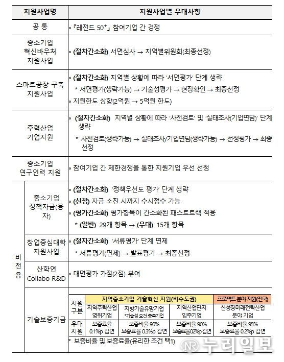 또한 정책자금, 창업·성장, R&D, 보증 분야에는 선정 절차 간소화, 평가 면제 또는 가점 부여, 지원한도 상향, 보증조건 우대 등 현장의 의견을 반영한 다양한 제도개선 사항이 적용된다.