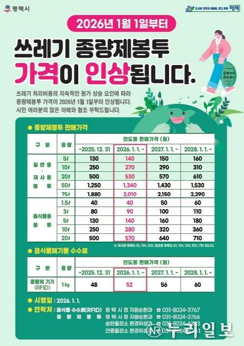 (누리일보) 평택시는 2026년 1월 1일부터 쓰레기 종량제 봉투 가격을 3개년도에 걸쳐 인상한다.