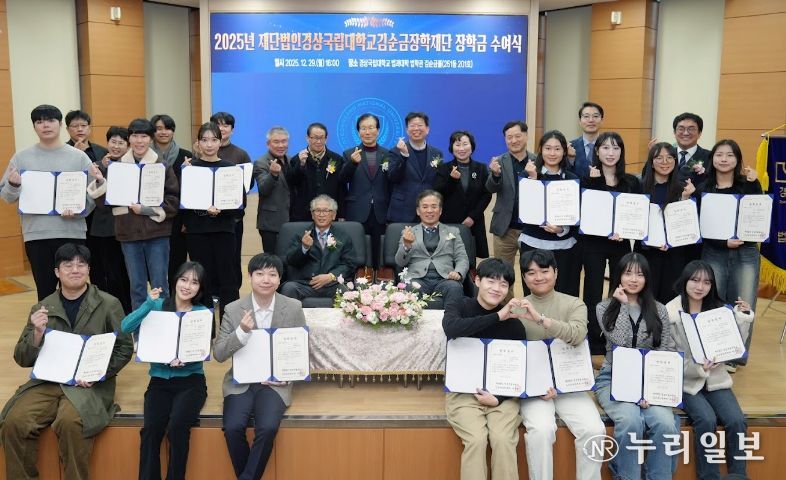 (누리일보) ‘재단법인 경상국립대학교 김순금 장학재단’은 12월 29일 오후 4시 법과대학 ‘김순금홀’에서 2025년 장학금 수여식을 개최했다.