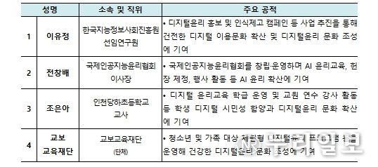 ‘디지털윤리 문화조성 유공’ 표창에는 디지털윤리 교육 및 인식 제고에 기여한 공로로 이유정 한국지능정보원 선임과 전창배 국제인공지능윤리협회 이사장, 조은아 인천당하초등학교 교사, 교보교육재단(단체)이 선정됐다.