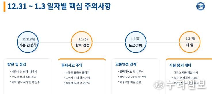 (누리일보) 전북자치도는 31일 해넘이와 1월 1일 해맞이를 앞두고 기온 급강하와 대설 가능성이 있는 가운데 도민과 방문객의 안전한 연말연시를 위해 현장 안전관리에 총력을 기울인다.