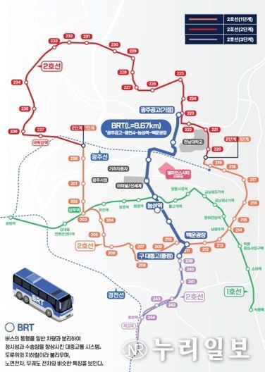 (누리일보) 광주시가 대규모 도시개발로 교통 혼잡이 예상되는 광천권역에 도입하는 ‘백운~매곡 간선급행버스체계(BRT)’ 구축 사업을 올해 본격 추진한다.