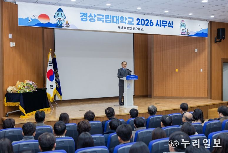 (누리일보) 경상국립대학교는 1월 2일 오전 11시 가좌캠퍼스 박물관 대강당에서 2026년 시무식을 개최했다. 시무식은 개식, 국민의례, 총장 신년사, 시상식, 폐식, 기념촬영의 순으로 진행됐다.