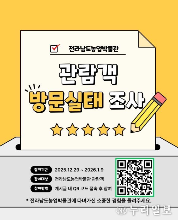 (누리일보) 전라남도농업박물관이 관람객의 이용 실태를 파악하고, 농업박물관 어린이 복합문화관 건립에 대한 도민 인식을 수렴하기 위해 9일까지 총 2종의 설문조사를 실시한다.