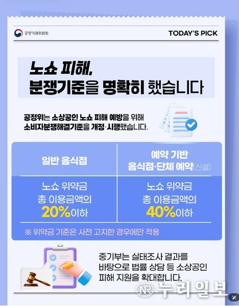 (누리일보) 공정위는 소상공인 노쇼 피해 예방을 위해 소비자분쟁해결기준을 개정·시행했습니다.