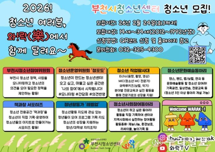 (누리일보) 부천여성청소년재단이 운영하는 부천시청소년센터는 2026년 청소년 참여자치조직 및 동아리 활동에 참여할 청소년·청년을 모집한다. 부천시청소년센터는 청소년의 자치 역량 강화와 주도적 참여 확대를 위해 참여, 문화예술, 진로직업탐색 등 다양한 활동을 운영하고 있다.