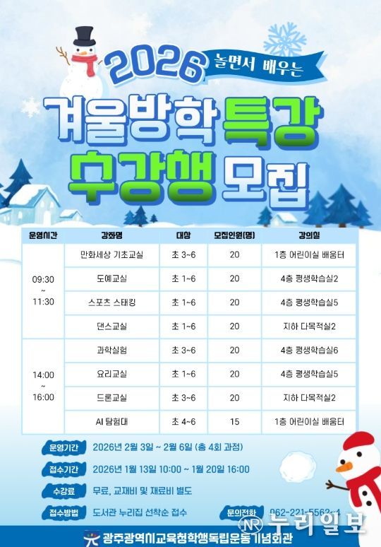 (누리일보) 광주시교육청학생독립운동기념회관은 겨울방학을 맞아 오는 2월 3~6일 ‘겨울방학 특강’을 운영한다.