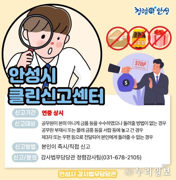 (누리일보) 안성시는 시민들에게 신뢰받는 공정하고 투명한 행정 서비스를 제공하기 위해 ‘클린신고센터’를 연중 상시운영하며 청렴한 행정문화 정착에 힘쓰고 있다고 밝혔다.