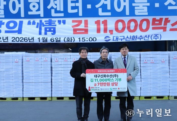 (누리일보) 대구농수산물도매시장 내 대구신화수산(주)(대표 고중근)은 1월 6일 대구농수산물도매시장에서 대구사회복지공동모금회를 통해 김 1만 1천 박스(7천만 원 상당)를 기부했다.