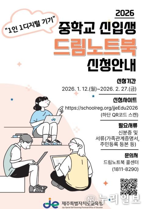 (누리일보) 제주특별자치도교육청은 12일부터 인공지능(AI) 대전환 시대를 맞아 도내 학생들의 디지털 학습 역량을 강화하기 위해 중학교 신입생을 대상으로 ‘2026학년도 드림노트북 지원(대여) 사업’ 신청을 받는다.