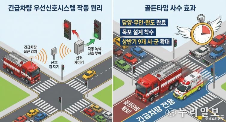 (누리일보) 전남소방본부는 화재·구급 등 위급 상황 발생 시 소방차와 구급차의 신속한 현장 도착을 돕기 위해 ‘긴급차량 우선신호시스템’을 확대 운영한다고 밝혔다.
