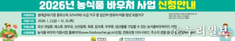 박상미 전남도 농식품유통과장은 “농식품 바우처 사업을 통해 취약계층이 신선한 농식품을 보다 쉽게 접하고 지역 농산물 소비 활성화에도 기여하도록 지원하겠다”며 “특히 올해부터 청년층까지 지원 대상을 확대해 더 많은 가구가 혜택을 누리도록 적극 홍보하겠다”고 말했다.