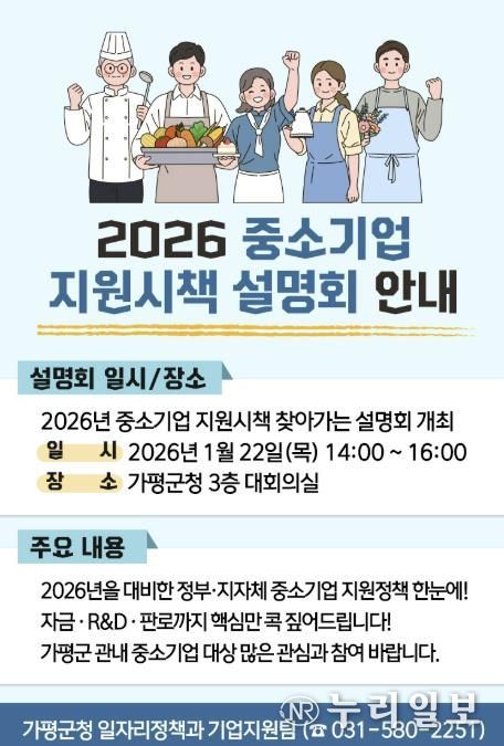 (누리일보) 가평군이 관내 중소기업의 경영 안정과 경쟁력 강화를 위해 새해 정부의 지원시책을 한자리에 모아 안내하는 설명회를 연다.