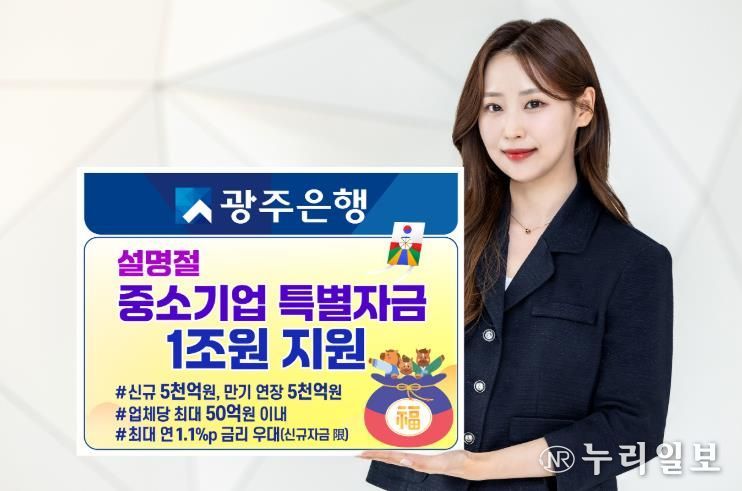 (누리일보) 광주은행은 설 명절을 앞두고 자금 운용에 어려움을 겪는 지역 중소기업 및 소상공인을 위해, 1월 15일부터 2월 27일까지 총 1조 원 규모의 ‘2026년 설 명절 중소기업 특별자금’을 지원한다고 밝혔다.