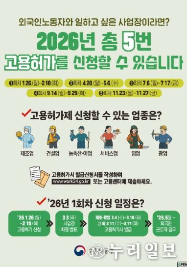 (누리일보) 고용노동부는 구인난을 겪는 기업이 이주노동자(E-9)를 고용할 수 있도록 ‘26년도에도 5차례 신규 고용허가 신청․접수를 진행할 예정이라고 밝혔다.