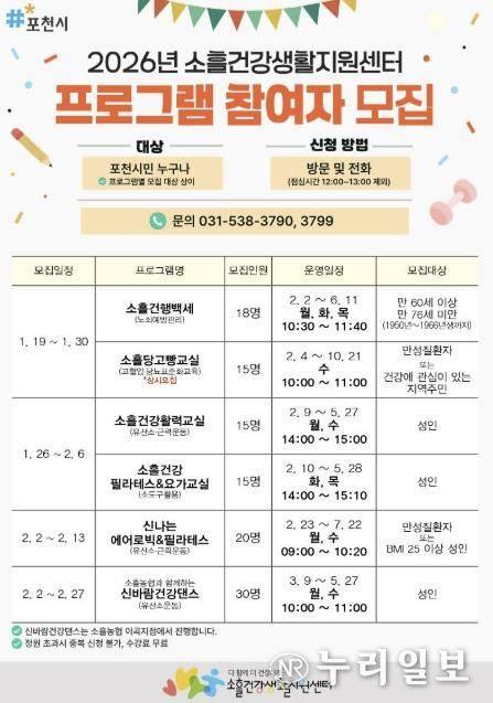 (누리일보) 포천시 소흘건강생활지원센터는 시민들의 건강 증진과 활기찬 일상 지원을 위해 오는 19일부터 ‘2026년 상반기 건강증진 프로그램’ 참여자를 모집한다.