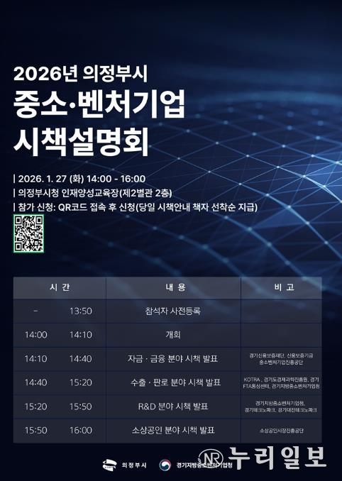 (누리일보) 의정부시는 1월 27일 시청 인재양성교육장에서 ‘2026년 중소‧벤처기업 시책설명회’를 개최한다.