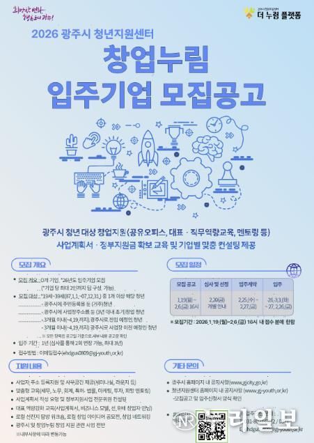 (누리일보) 광주시는 지역 내 유망한 청년 창업가를 발굴하고 안정적인 창업 환경을 조성하기 위해 ‘2026년도 창업누림 신규 입주기업’을 공개 모집한다고 19일 밝혔다.