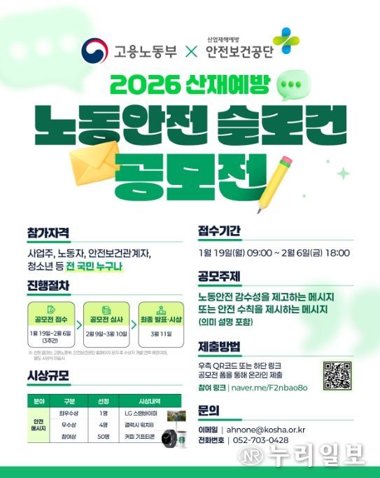(누리일보) 고용노동부와 한국산업안전보건공단은 1월 19일부터 우리 국민 누구나 참여할 수 있는 산재예방 노동안전 슬로건 공모를 실시한다.