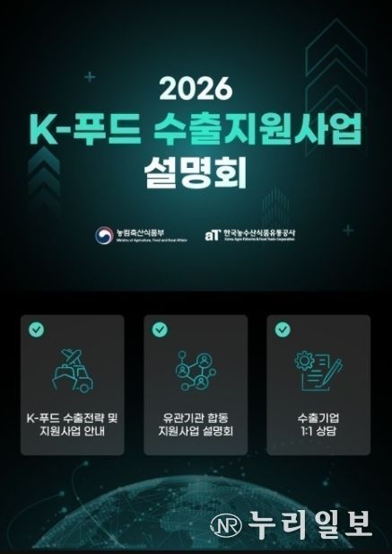 (누리일보) 농림축산식품부는 K-푸드의 글로벌 진출 확대를 위해 전년보다 900억원 증가한 7,070억원 규모의 2026년 K-푸드 수출지원사업 설명회를 1월 23일 서울 과학기술컨벤션센터에서 개최한다고 밝혔다.
