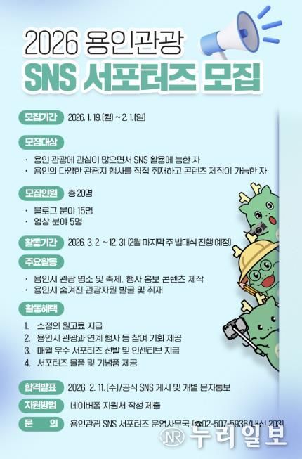 (누리일보) 용인특례시는 2월 1일까지 용인의 관광자원과 다채로운 축제·행사를 시민의 시각에서 생동감 있게 홍보할 ‘용인관광 SNS 서포터즈’를 모집한다고 20일 밝혔다.