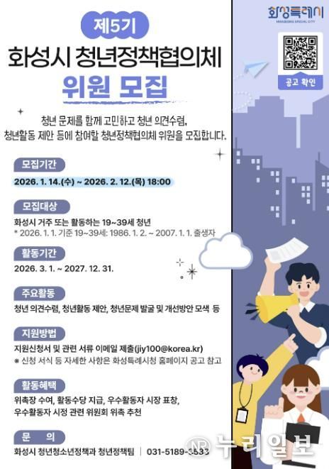 (누리일보) 화성특례시는 다음 달 12일까지 ‘제5기 화성시 청년정책협의체 위원’을 모집한다고 19일 밝혔다.