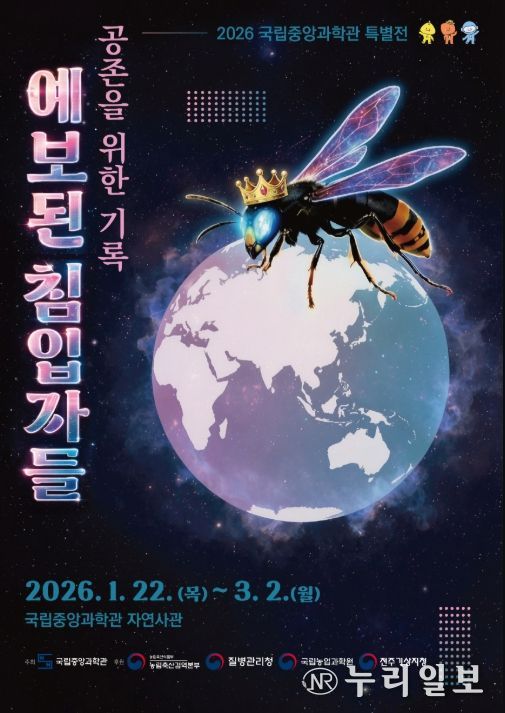 (누리일보) 미래의 꿈을 만드는 과학기술 문화 이음터(플랫폼) 과학기술정보통신부 국립중앙과학관은 1월 22일부터 3월 2일까지 자연사 관에서 인공지능(AI) 기술을 활용해 다양한 기후변화에 따른 해충의 위협과 슬기로운 대응을 다룬 해충특별전 ‘2026년 예보된 침입자들: 공존을 위한 기록’을 개최한다고 밝혔다.