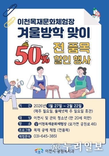 (누리일보) 이천시는 겨울방학을 맞아 어린이 및 청소년들에게 특별한 체험 기회를 제공하기 위해 목재문화체험장 이용료를 50% 할인하는 행사를 진행한다고 밝혔다.