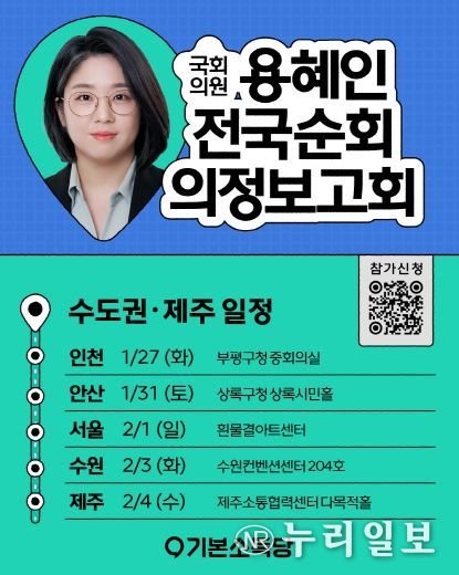 (누리일보) 기본소득당 용혜인 의원이 오는 1월 27일부터 2월 3일까지 인천광역시, 경기 안산시, 서울특별시, 경기 수원특례시를 차례로 찾아 '국민과 함께 한 걸음 더' 수도권 의정보고회를 연다.