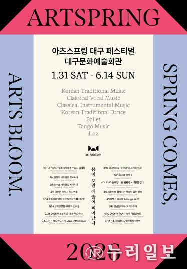 (누리일보) 대구문화예술회관은 대구를 기반으로 활동하는 지역 예술인들의 공연을 한데 모아 그들의 예술혼을 집중 조명하는 축제 '2026 아츠스프링 대구 페스티벌'의 16개 공연을 오는 1월 31일부터 6월 14일까지 대구문화예술회관에서 개최한다고 밝혔다.