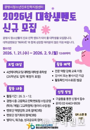 (누리일보) 광명시청소년재단 청소년진로진학지원센터는 관내 중·고등학교 청소년 대상 학과 멘토링 운영을 위해 ‘2026년 대학생 멘토단(wave)’을 모집한다고 밝혔다.