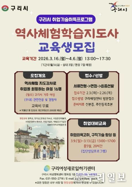 (누리일보) 구리시는 구리새일센터에서 구리시 거주 여성을 대상으로 운영하는 ‘2026년 취업 기술 취득프로그램’ 가운데 역사 체험학습 지도사 과정 교육생을 오는 2월 3일부터 모집한다고 밝혔다.