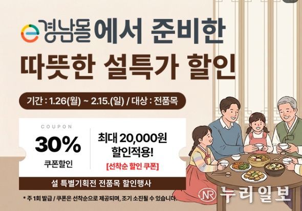 (누리일보) 경상남도와 (재)경상남도투자경제진흥원이 운영하는 e경남몰은 1월 26일부터 예산 소진 시까지 ‘2026년 풍성한 설맞이 할인 기획전’을 진행한다.