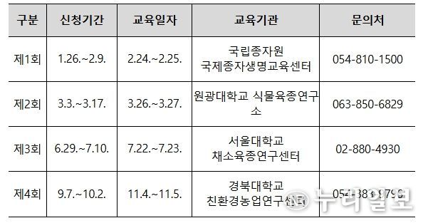 교육운영 방식은 전년도 교육 수료자들의 의견을 반영하여 집합(24일)과 온라인교육(25일)을 병행하여 운영되며 교육 신청자는 관련 세부 사항 및 일정(교육신청: 1.26~2.9)을 국제종자생명교육센터 누리집에서 확인할 수 있다.