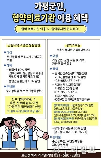 (누리일보) 가평군은 24시간 응급실과 심야약국 운영, 협약병원 감면 혜택을 다시 한번 종합적으로 안내하며 군민들의 적극적인 이용을 당부했다. 기존부터 시행중인 제도들이지만 군민들이 내용을 정확히 알지 못해 이용하지 못하는 사례를 줄이기 위해서다.