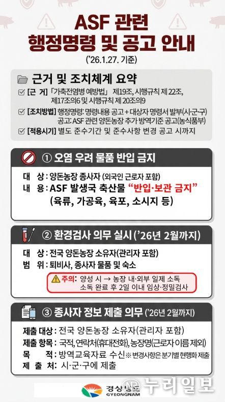 (누리일보) 경상남도는 전남 영광 종돈장에서 아프리카돼지열병(ASF)이 발생하는 등 전국적으로 확산 우려가 커짐에 따라, 도내 모든 양돈농장과 축산시설을 대상으로 고강도 방역 대책을 추진한다고 밝혔다.