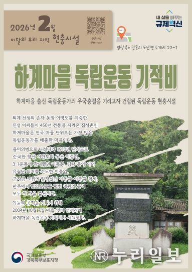 (누리일보) 경북북부보훈지청은 2026년 2월 이달의 우리 지역 현충시설로 ‘하계마을 독립운동 기적비’(경상북도 안동시 도산면 토계리 22-1)를 선정했다.