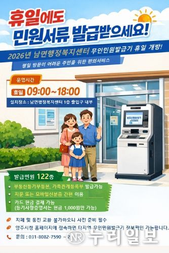 (누리일보) 양주시 남면 행정복지센터는 행정복지센터 내에 설치된 무인민원발급기 운영일을 기존 평일에서 휴일까지 확대해 지난 17일부터 운영을 시작했다고 밝혔다.