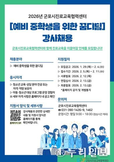 (누리일보) (재)군포시청소년재단 군포시진로교육협력센터는 관내 예비중학생의 학교 적응과 진로 기초 역량 강화를 위해 '2026년 군포시진로교육협력센터 예비중학생을 위한 꿈디딤' 프로그램에 참여할 강사를 채용한다고 밝혔다.