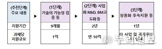 먼저, 1단계는 유망기술 발굴 및 비즈니스 모델 수립 등을 위해 총 80개의 기획과제를 지원한다. 이를 통해 기술의 시장 적합성과 사업화 가능성을 미리 검증하고 후속 R&D 과제 연계를 위한 기반을 마련한다. 이어 2단계에서는 1단계에서 수립된 기획을 바탕으로, 경쟁형 방식을 도입하여 우수기술들을 선별하게 된다. 선별된 과제들을 대상으로 비즈니스 모델 고도화, 사업화R&D 및 시제품 제작 등을 지원한다. 지원규모는 연 10억 원 수준(최대 2년)으로 총 20개의 사업화 R&D 과제를 지원할 계획이다.