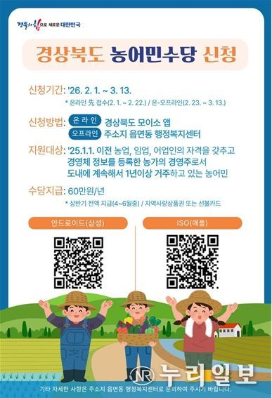 (누리일보) 경상북도는 농어업과 농어촌의 공익적 가치를 유지·증진하는 농어민지원을 위해 추진하고 있는 ‘2026년 경상북도 농어민 수당’신청을 오는 2월 1일부터 접수한다.