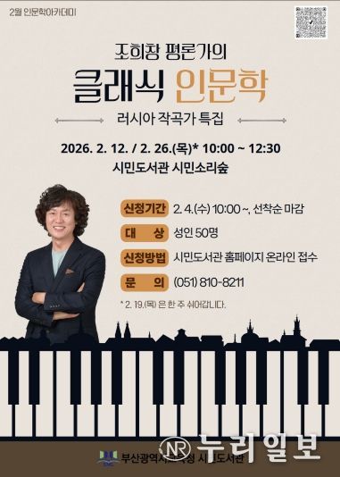 이은경 시민도서관장은 “이번 특강은 어렵게 느껴질 수 있는 클래식 음악을 보다 쉽고 친근하게 접할 수 있는 기회가 될 것”이라며, “러시아 음악가들의 삶과 예술을 통해 깊은 위로와 통찰을 얻는 시간이 되길 바란다”고 말했다.