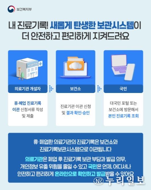 (누리일보) 보건복지부와 한국보건의료정보원은 다니던 병원이 문을 닫아도 국민이 자신의 진료기록을 보다 편하게 확인할 수 있도록 휴·폐업 의료기관 진료기록보관시스템 개선을 추진한다고 밝혔다.