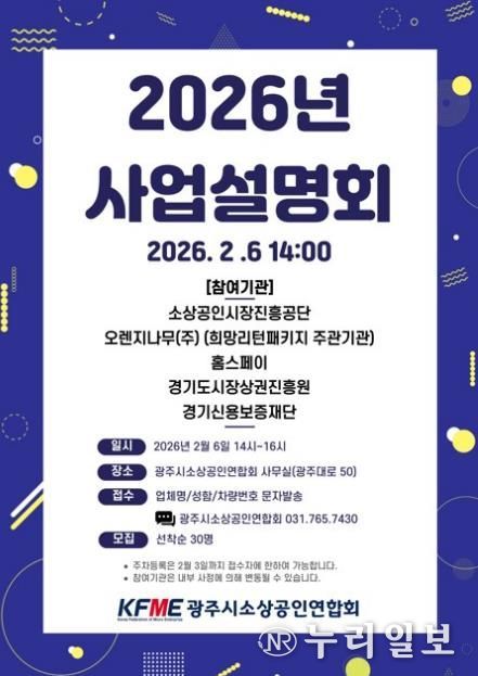 (누리일보) 광주시소상공인연합회는 지역 소상공인을 대상으로 2026년도 주요 정책과 지원사업을 안내하는 사업설명회를 개최한다고 3일 밝혔다.