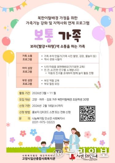 (누리일보) 고양시일산종합사회복지관이 북한이탈배경 가정의 가족기능 강화 및 지역사회 통합 프로그램 ‘보통 가족’의 참여자를 이달 18일까지 모집한다.